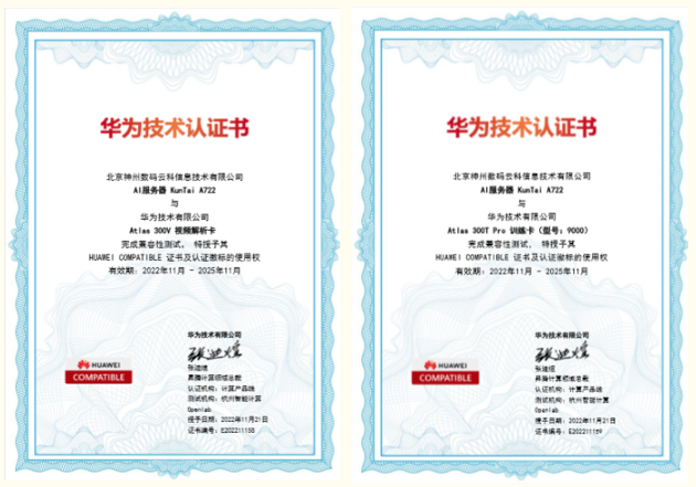 近期,mile米乐M6KunTai A722服务器顺利获得华为“Atlas 300V 视频解析卡”以及“Atlas 300T Pro 训练卡(型号:9000)”两项技术认证,为智能算力再添新力!
