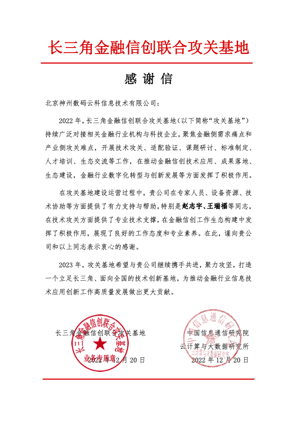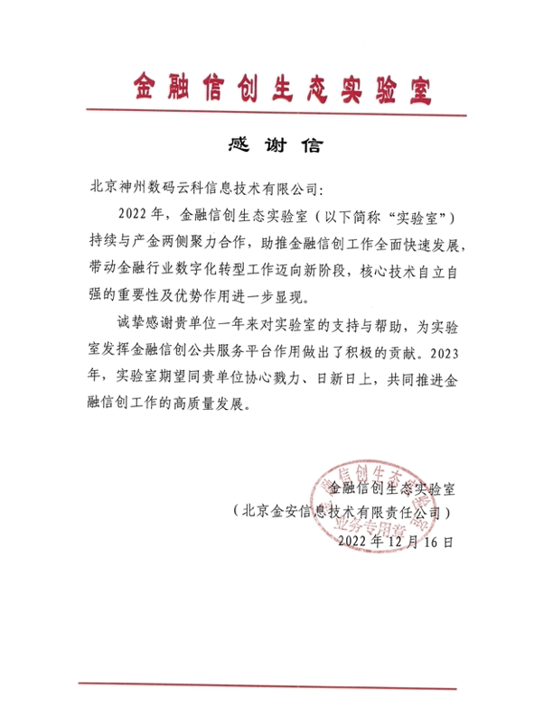 新年伊始,神州数码信创业务陆续收到金融行业客户与伙伴的真挚感谢,这一封封感谢信代表着神州数码信创业务在金融信创领域的开拓初现成效,也充分表达了客户与伙伴对神州数码信创业务实力的认可。