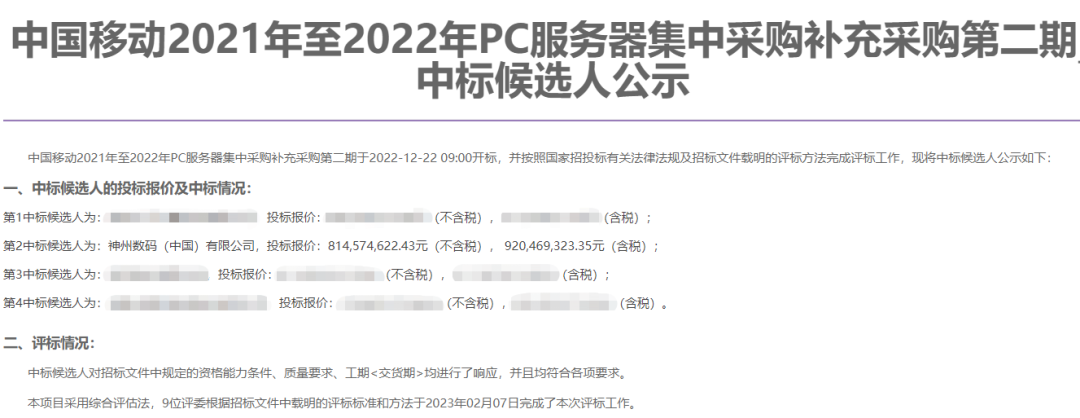 近期,中国移动采购与招标网发布《中国移动2021年至2022年PC服务器集中采购补充采购第二期中标候选人公示》,神州数码集团股份有限公司下属控股子公司神州数码(中国)有限公司为该项目中标候选人之一,投标报价为814,574,622.43元(不含税),中标份额30%。神州数码信创业务在2023年取得开门红,持续深耕运营商行业,为行业数字化转型升级给予坚实的算力基座。