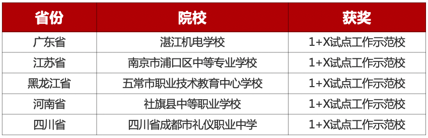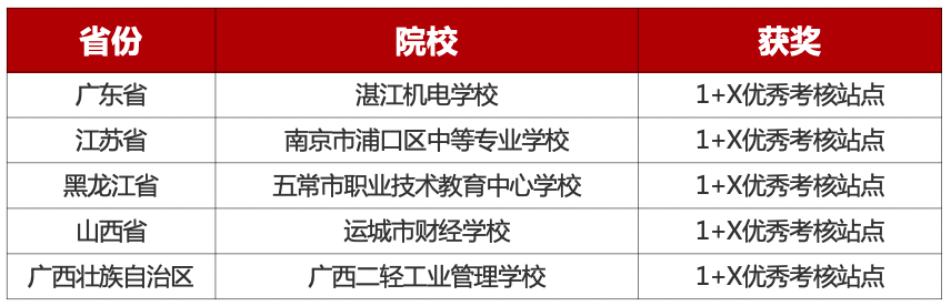 表彰在落实1+X证书试点工作中,以学生就业能力提升为导向,坚持育训结合,落实书证融通,并在持续深入推进1+X证书中高级考核站点建设中做出贡献的院校。