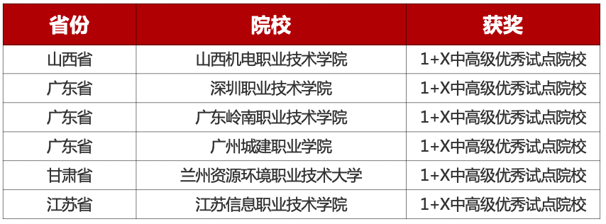 表彰在1+X证书试点工作中,深化改革、注重人才培养、推进产教融合、课证融通,持续参与组织配合1+X考评工作,学生参与态度持续,院校组织协调能力强对证书试点推进落实成效突出示范带头作用明显的院校。