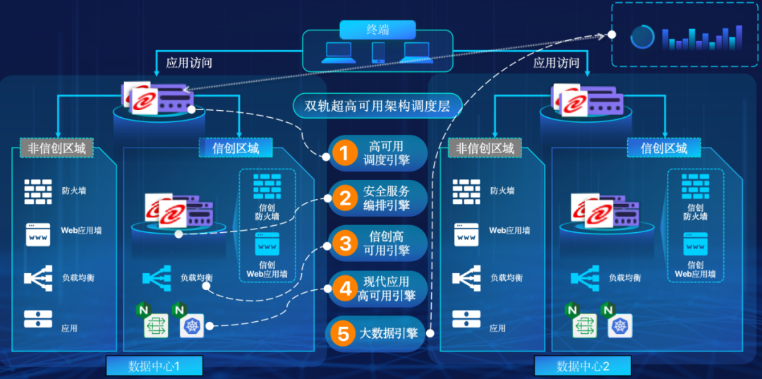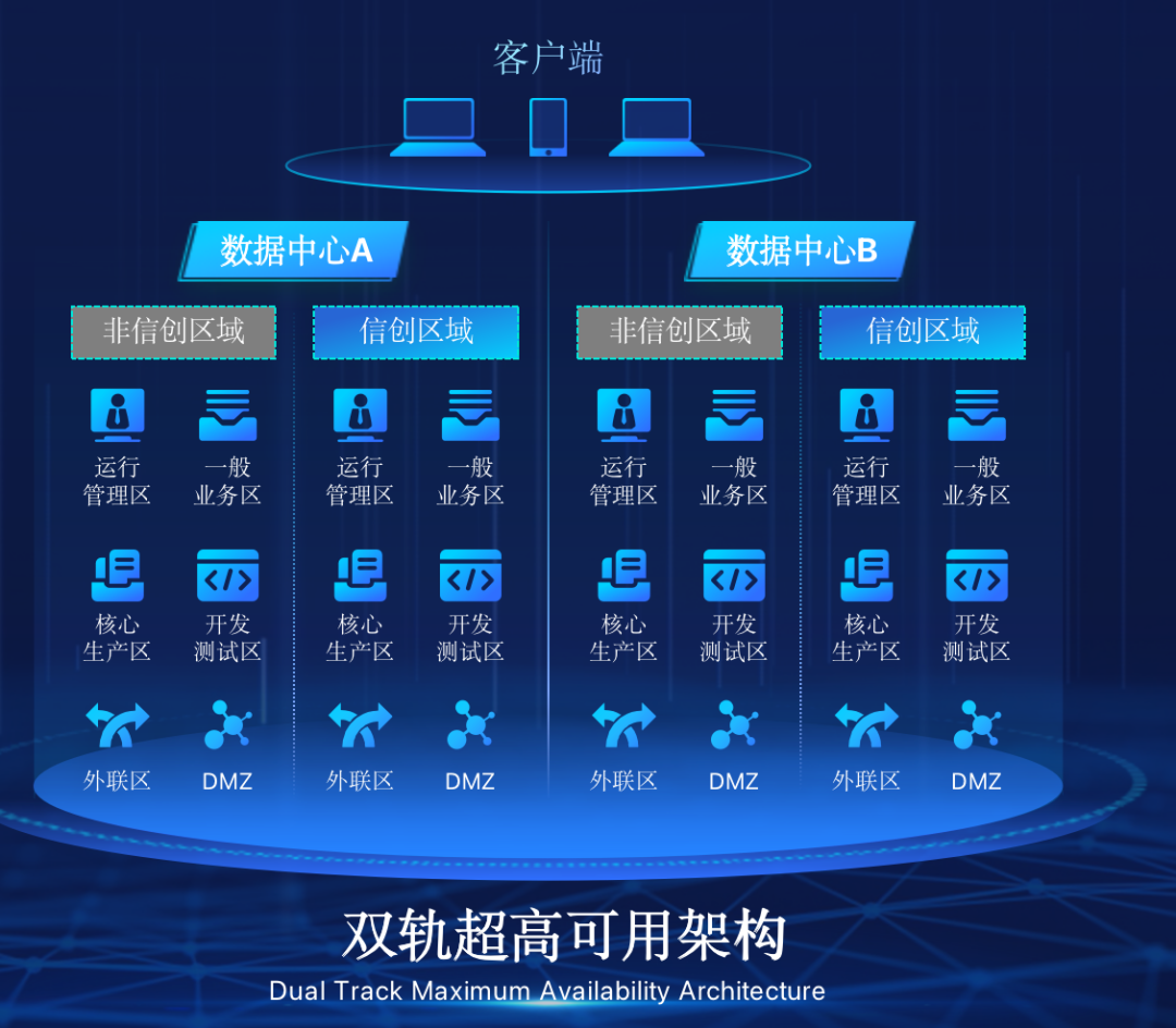 mile米乐M6在企业面临自主创新IT基础重构过程中,推出的全新架构双轨超高可用架构(简称DTMAA),在双活数据中心的分区调度基础上,添加每个数据中心内信创域和非信创域的分域调度,来实现分区分域协同的多活双轨超高可用。